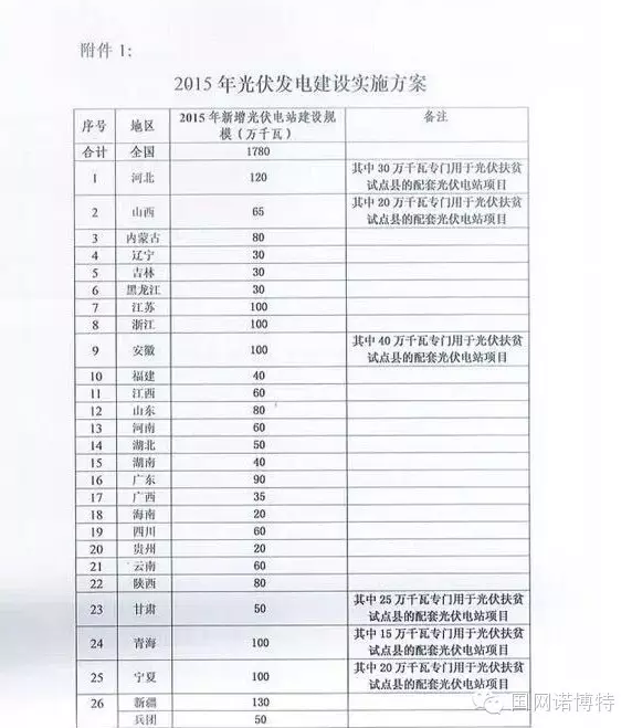 國家能源局關(guān)于下達(dá)2015年光伏發(fā)電建設(shè)實(shí)施方案的通知